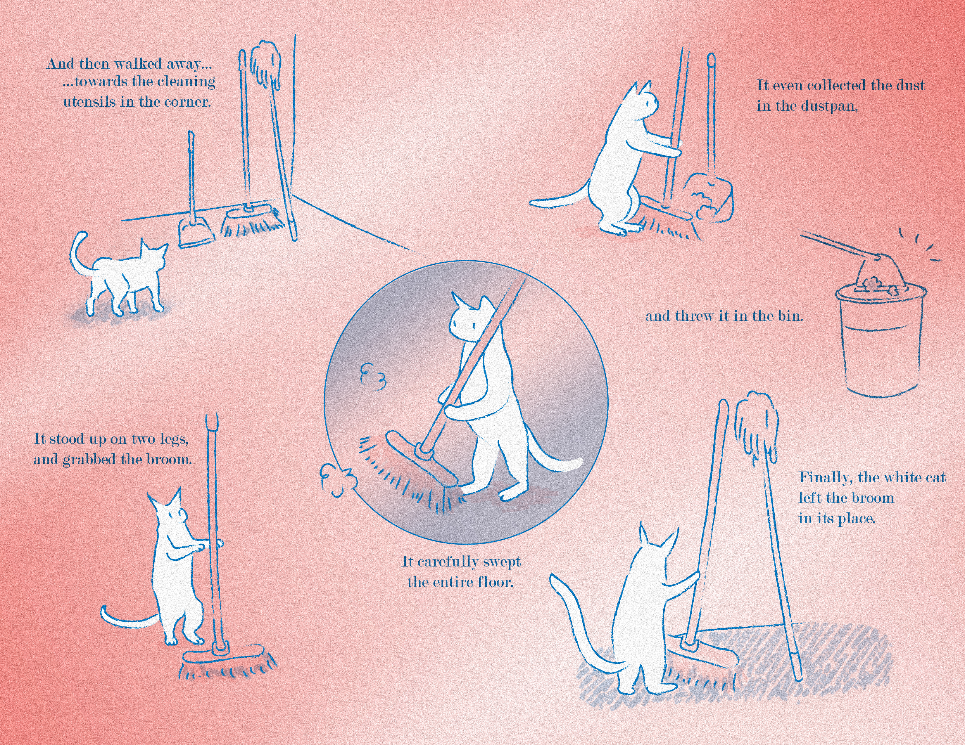 Illustrated short story about a magical cat that helps out with house chores in exchange for food.
